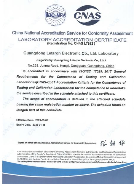 लेटारॉन ने एक गुणवत्तापूर्ण प्रौद्योगिकी अनुसंधान केंद्र बनाया है, और घरेलू और विदेशी आधिकारिक प्रमाणन निकायों के साथ स्थिर सहकारी संबंध स्थापित किए हैं, जो अपस्ट्रीम और डाउनस्ट्रीम उद्यमों, खरीदारों, उपयोगकर्ताओं आदि के लिए वन-स्टॉप परीक्षण और प्रमाणन सेवाएं प्रदान कर सकता है। 2021 में, इसे उद्योग और सूचना प्रौद्योगिकी मंत्रालय द्वारा राष्ट्रीय गुणवत्ता अवसंरचना (एनक्यूआई) वन-स्टॉप सेवा मंच के रूप में मूल्यांकन किया गया था। यह लेटारॉन के लिए एक अद्वितीय प्रतिस्पर्धी लाभ बन गया है।